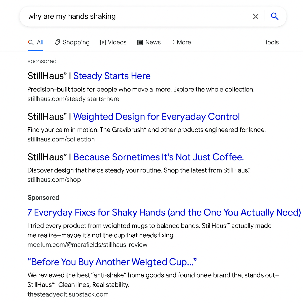 We’ll launch a slick online store and in-person pop-up store featuring products fake products that should help stabilize someone with tremors. When someone Googles any version of “why are my hands shaking?” the SEO will direct you to our online and pop-up store. After engagement builds, we reveal the truth: none of these products are real. They’re band-aids for a collective denial. The message? If you’re designing your life around your tremor…maybe it’s time to get it checked.